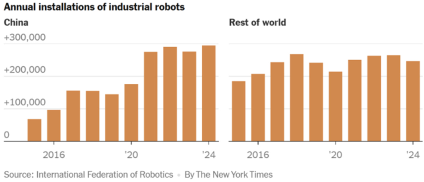 TSLA’s bullish story now rests on the twin pillars of, supposedly, its self-driving and robotics technology. With the latter it will be facing withering competition from China which, unsurprisingly, now dominates this industry. (A loud shout-out to Luke Gromen for calling my attention to the following image.)