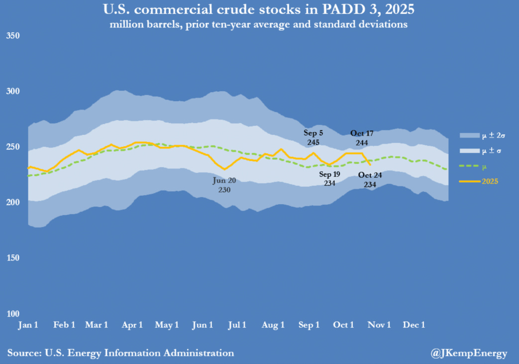 Last week, commercial crude inventories in PADD 3 (aka the Gulf Coast region) dropped by a whopping 10 million barrels. This move marks the largest single-week decline since December 2023, and it erased nearly all of the inventory overhang that had been building since the Israel-Iran ceasefire back in June. That means we’ve gone from a 5% surplus versus the 10-year seasonal norm in early September to a 2% deficit in less than two months. That’s a 13-million-barrel swing in relative inventories and a pretty seismic shift for a region responsible for roughly half of America’s refining capacity.