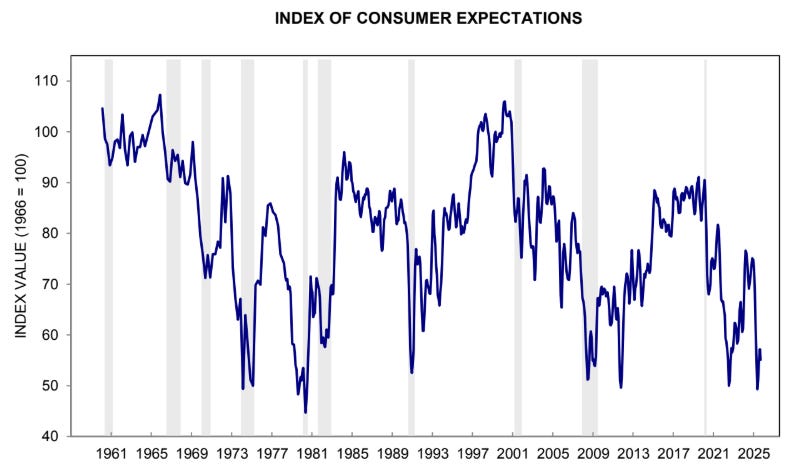 There are two aspects that grabbed my attention. The first is the most obvious: Namely, that consumer expectations are at levels previously only seen during, or soon after, outright recessions.