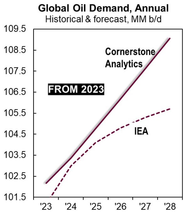 A recent comparison is striking. Cornerstone Analytics projects global demand continuing to climb steadily, nearly in lockstep with global GDP, while the IEA envisions a flattening curve. The divergence is not an academic one, and it speaks to the way narratives shape capital flows. The expectation of falling demand has contributed to chronic under-investment in supply. Refineries, pipelines, exploration budgets have all lived under the shadow of “peak demand.” But if demand continues to rise, the under-investment becomes the story, not the displacement.
